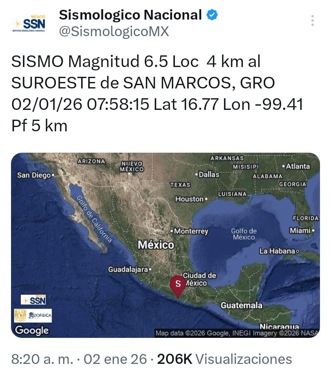 Ciudad de México, 2 de enero de 2026.- Un fuerte sismo de magnitud 6.5, con epicentro a 15 kilómetros al suroeste de San Marcos, Guerrero, cimbró esta mañana a la Ciudad de México y varios estados del centro y sur del país, generando momentos de angustia entre la población al activarse las alarmas sísmicas diseminadas por toda la capital.