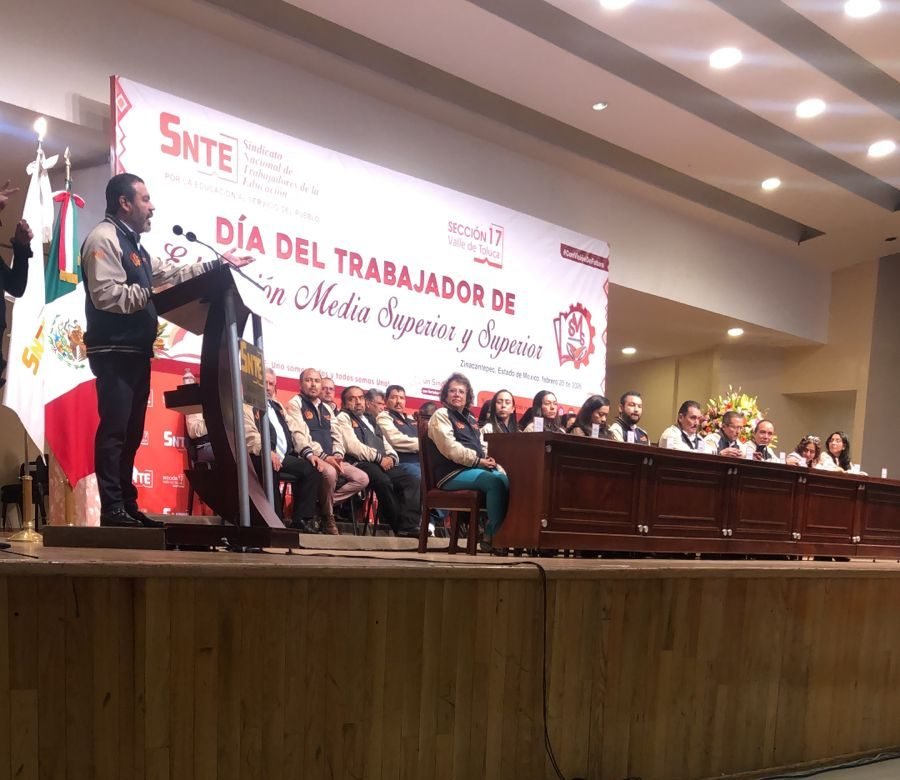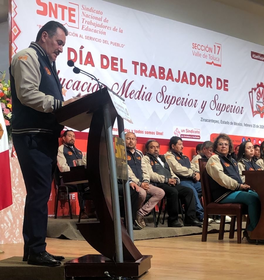 Zinacantepec, Estado de México, 20 de febrero 2026.- En la sede de la Sección 17 del Sindicato Nacional de Trabajadores de la Educación (SNTE), correspondiente al Valle de Toluca, se llevó a cabo la conmemoración del Día del Trabajador de Educación Media Superior y Superior, evento encabezado por el profesor José Alfredo Geraldo Benoit, secretario general de dicha sección. El acto incluyó la entrega de reconocimientos al personal docente, directivo, administrativo y de apoyo de ambos niveles educativos, y contó con la presencia de autoridades sindicales y funcionarios de los Servicios Educativos Integrados al Estado de México (SEIEM).