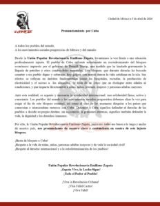 Ciudad de México, 5 de abril de 2026.— La Unión Popular Revolucionaria Emiliano Zapata (UPREZ) emitió un pronunciamiento público en el que expone su postura sobre la situación actual en Cuba, centrándose en los efectos del bloqueo económico impuesto por Estados Unidos.